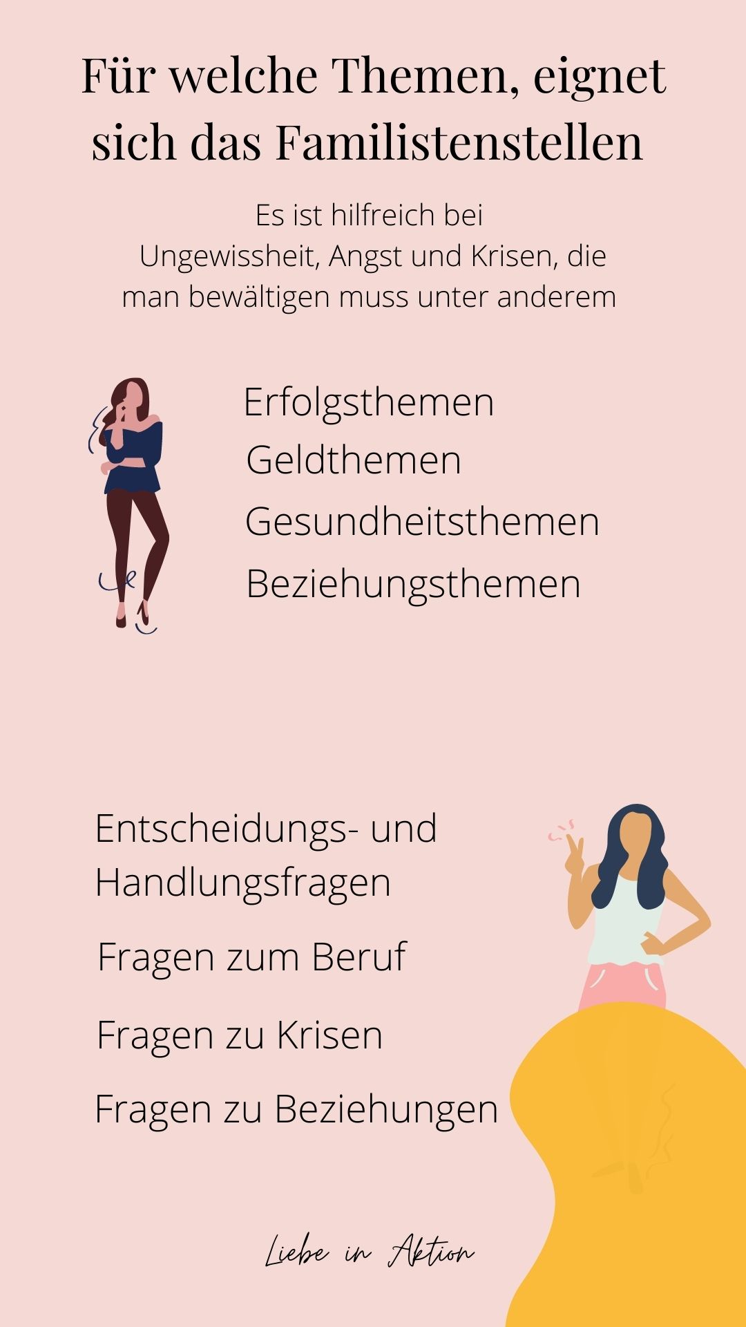 Man kommt zu einer Aufstellung weil man etwas für sich klären möchte. Das können Anliegen sein, die die Paarbeziehung betreffen, Probleme oder Konflikte im Beruf oder im Privaten, wenn Entscheidungen anstehen oder Handeln gefragt ist.